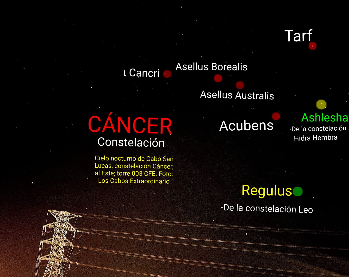La torre 003 (CFE) espectacular, como vigilante estelar, sobresale entre la luminosidad residencial del área. Hacia arriba, en el cielo nocturno de Cabo San Lucas, impresionante la constelación del zodíaco, Cáncer; se suman a la grata panorámica estelar, las estrellas Regulus (de la constelación Leo) y Ashlesha (de la constelación Hidra Hembra.