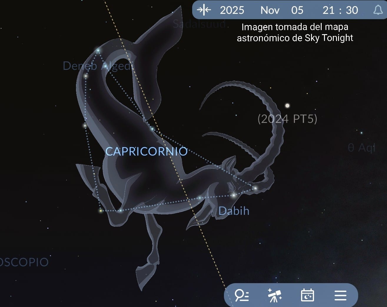 La tableta puesta sobre el horizonte, sobre todo ese lucerío. Y el mapa astronómico de Sky Tonight dando cuenta de la constelación Capricornio.