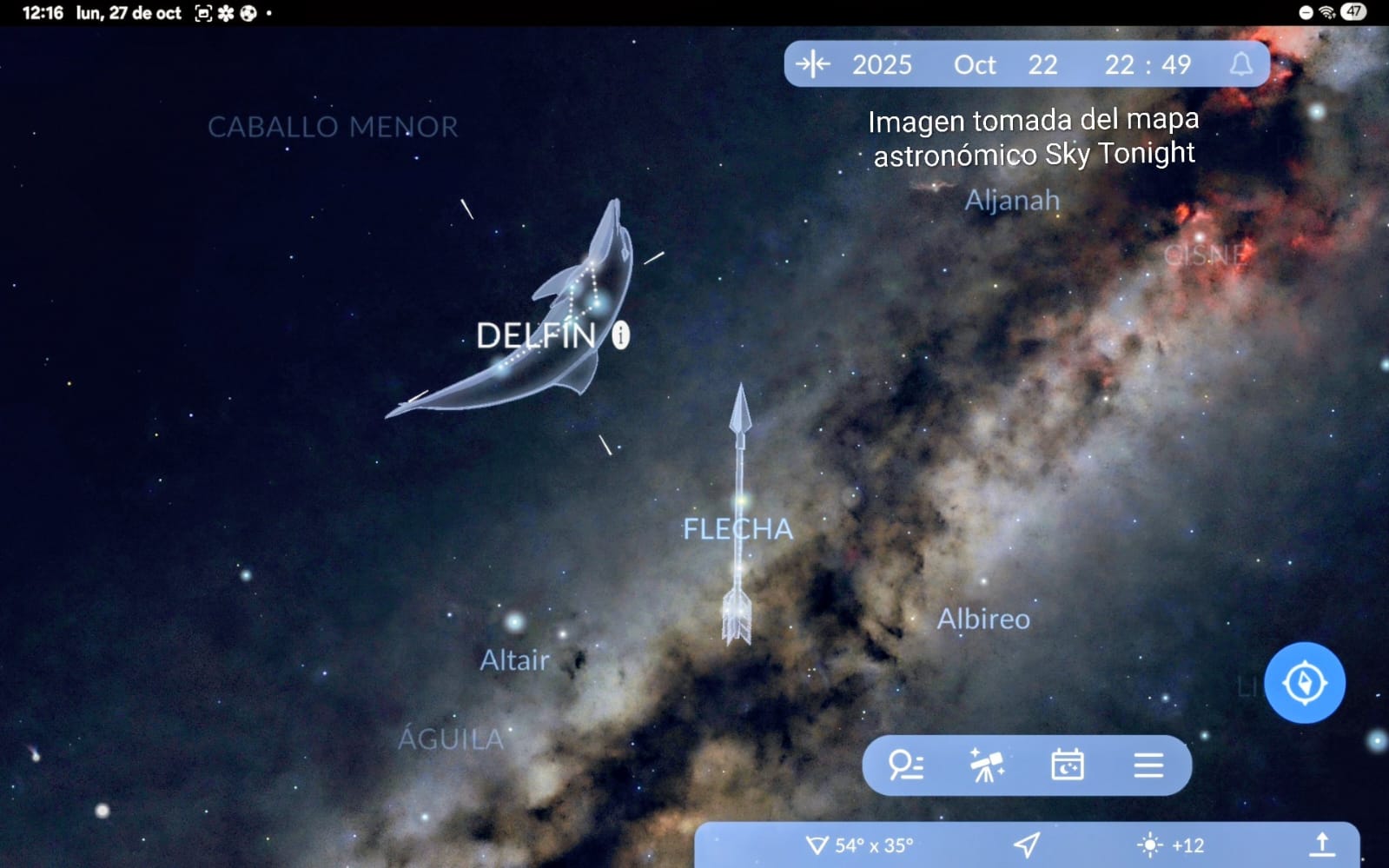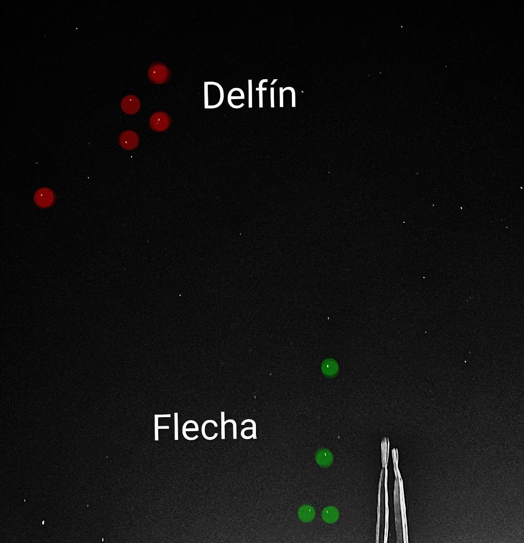 “Abajo” en diagonal a la derecha “cerca” de Delfín y en apariencia al lado de cactácea, un de las tres más pequeñas constelaciones de las 88 reconocidas por la comunidad astronómica internacional internacional: Flecha.