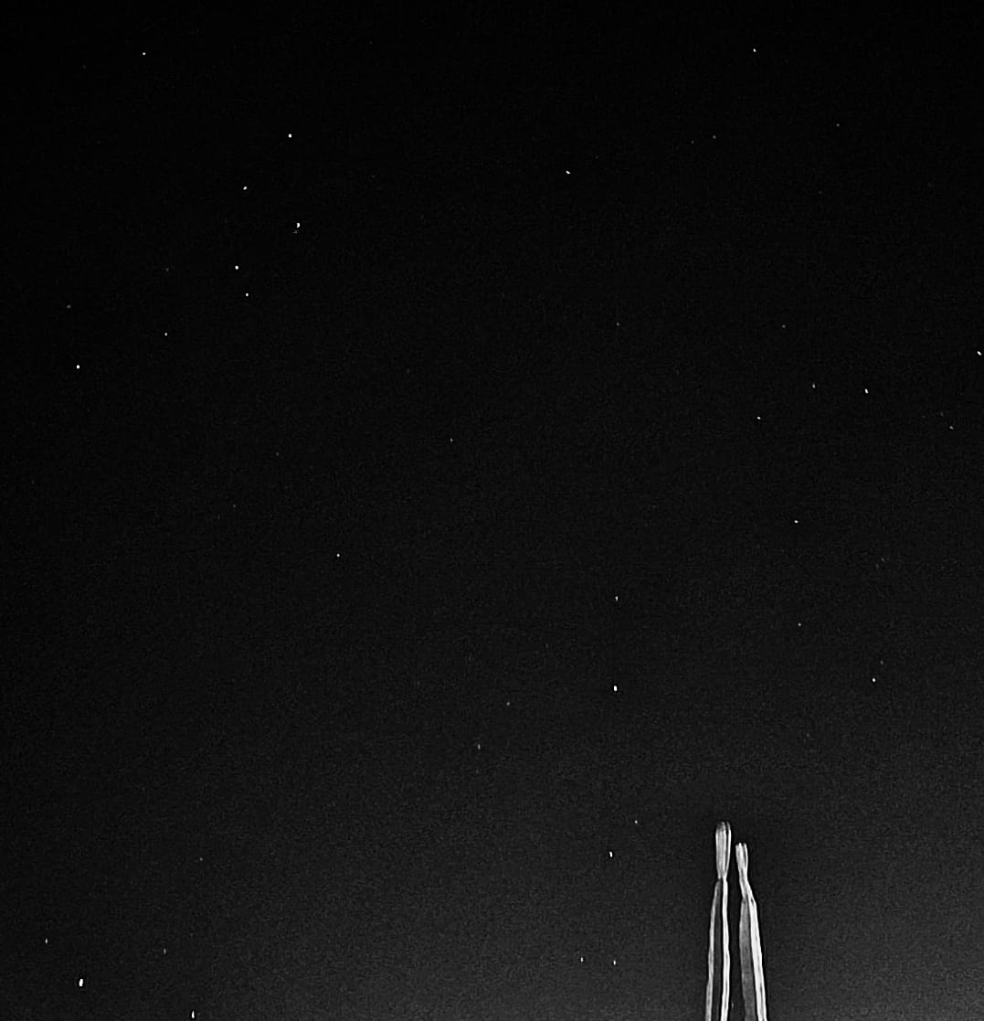 Al Oeste de Cabo San Lucas, la postal es bella con el cielo nocturno al final de la tierra peninsular con las constelaciones Delfín y Flecha, y a primer cuadro una cactácea.