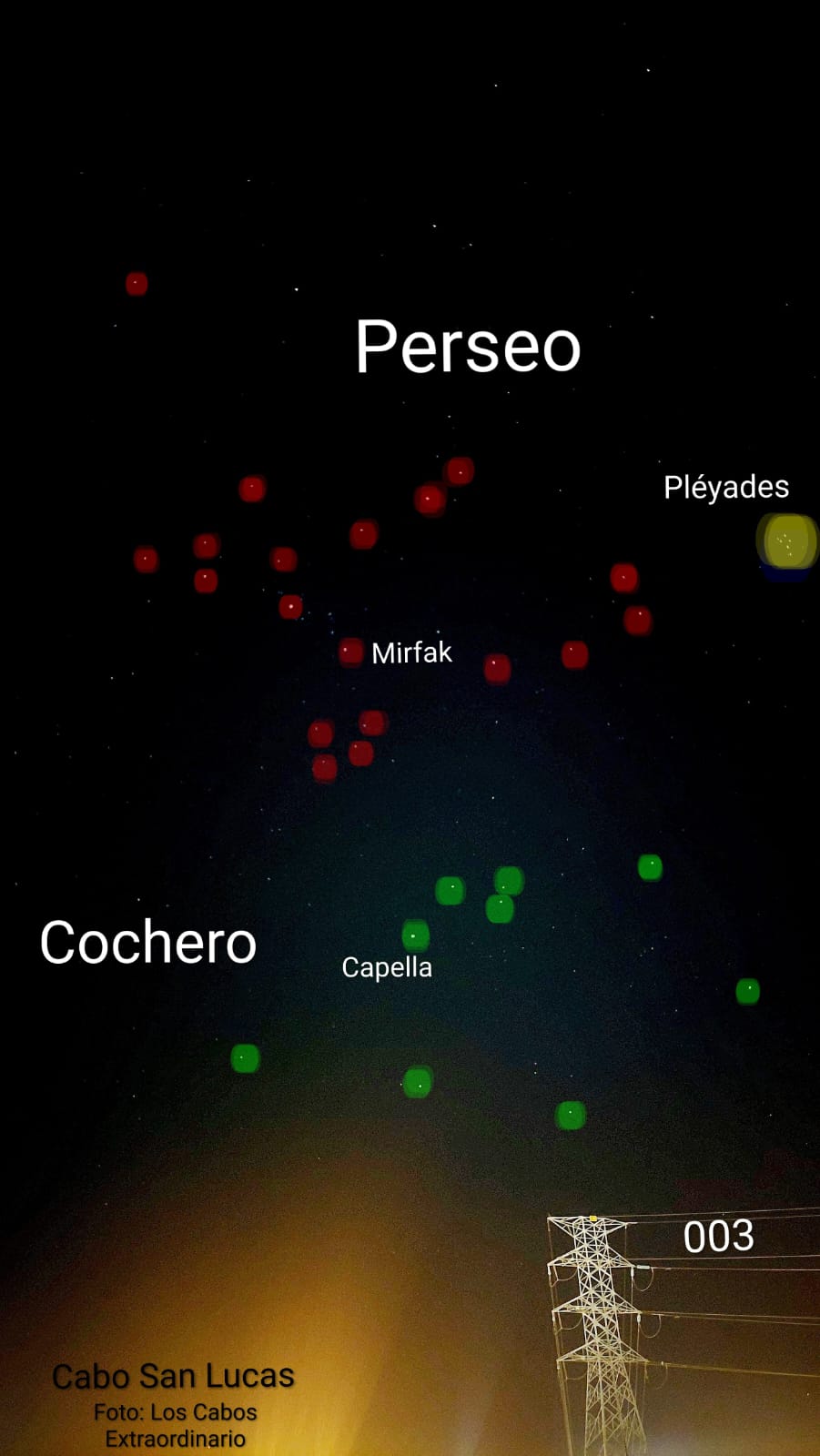 Las constelaciones Cochero y Perseo, y el cúmulo estelar de las bellísimas Pléyades (arriba a la derecha en la postal) se suman al saludo del Vigilante 003 y por tal a Cabo San Lucas.