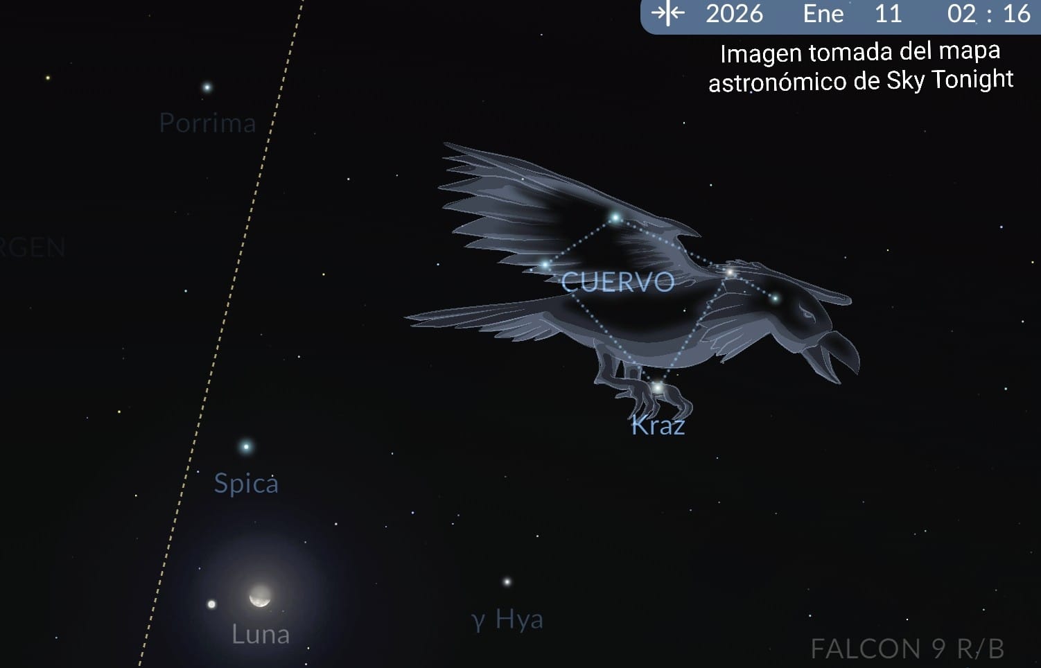 “Corvus o el Cuervo es una constelación pequeña con sólo 11 estrellas visibles a simple vista. γ Corvi (Gienah Gurab) y δ Corvi (Algorab) sirven de indicadoras para encontrar a Espiga (α Virginis).