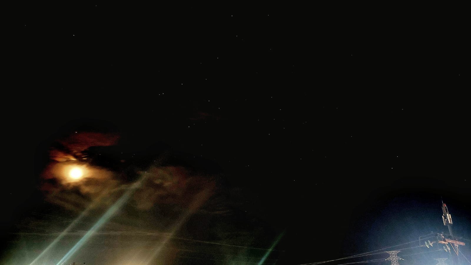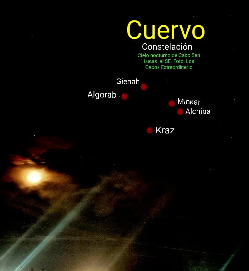 Minutos después de las 02:00 horas, en una franja hacia el sureste (SE) de Cabo San Lucas se hace visible el potencial destello de la luminosidad urbana en pleno cielo nocturno, lo que hace aún más espectacular el momento en que se observa –y se fotografía– la constelación Cuervo; la Luna Menguante en casi 40 por ciento de iluminación en diagonal izquierda abajo. En tierra, hacia la derecha, torres y cables de la CFE.