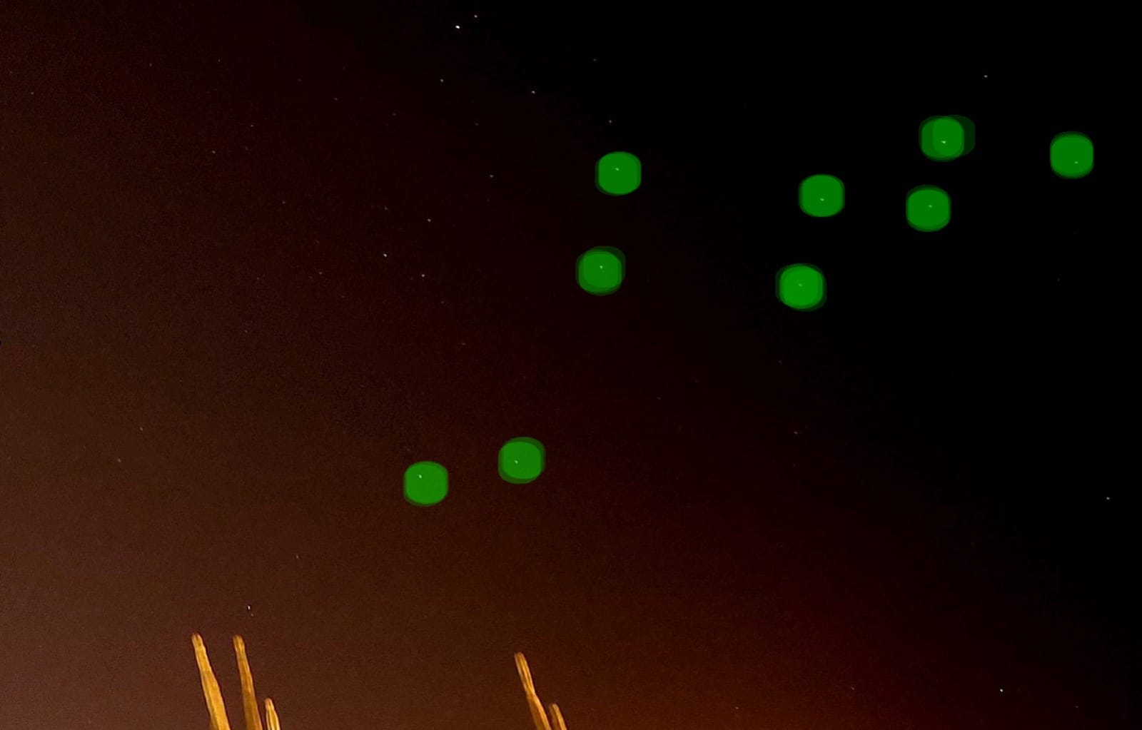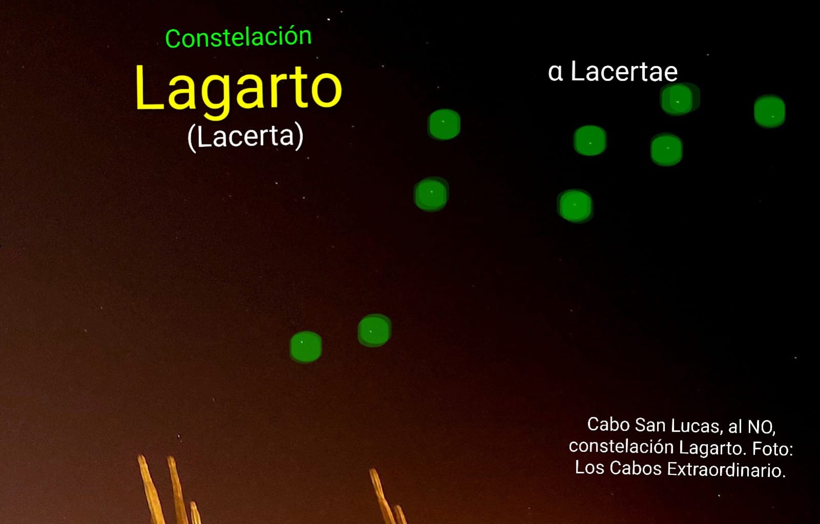 Por la luminosidad de la zona son visibles las cactáceas; son las 00:34 horas. En el enfoque hacia arriba en el cielo nocturno de Cabo San Lucas se alcanza a registrar gran parte del asterismo de Andrómeda, y entre Pegaso y Cefeo, la grata postal astronómica hacia el NO de Cabo San Lucas: la constelación Lagarto (Lacerta).