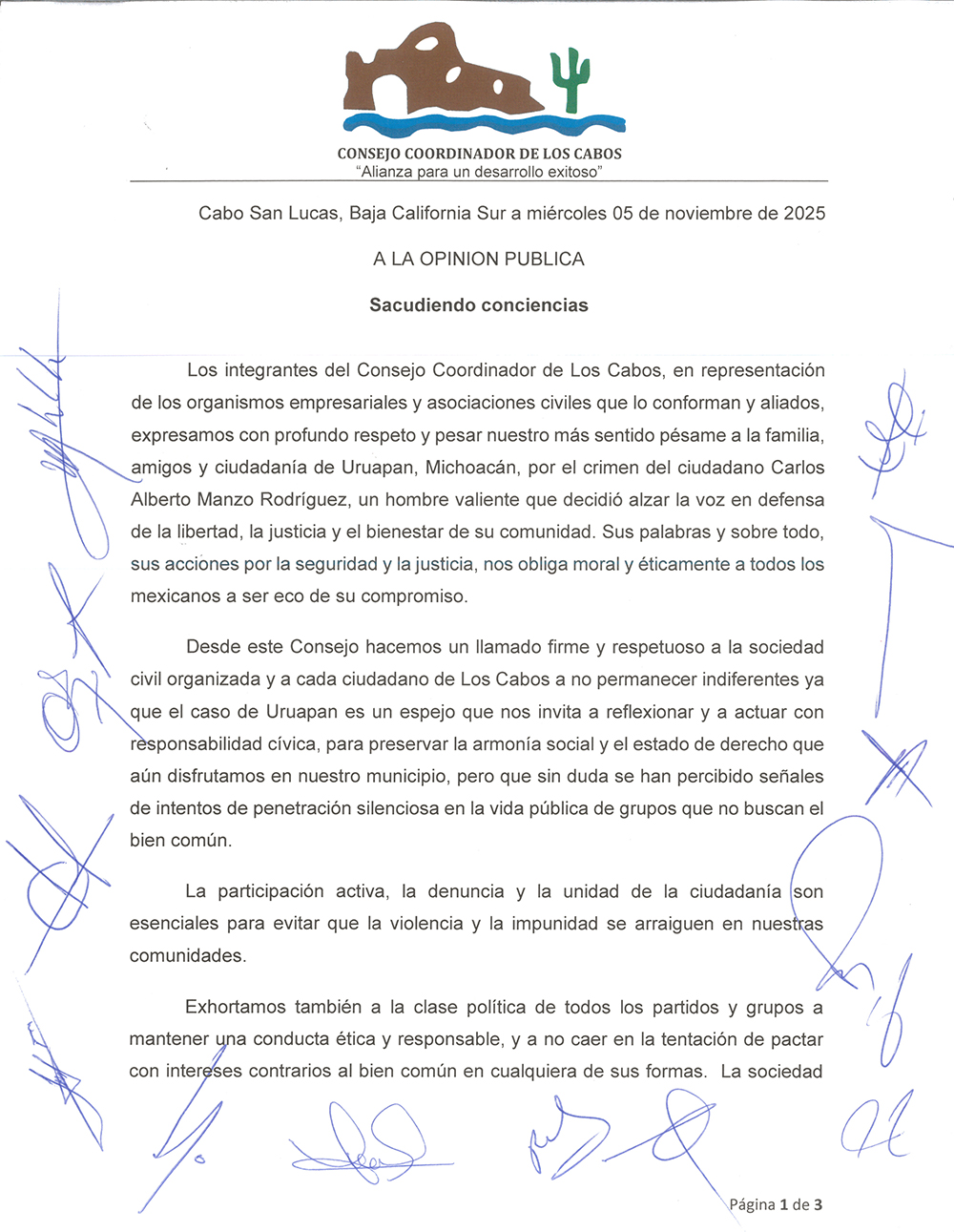 En un documento puntual, de integración social y sin quedarse en la comodidad de sólo mirar hacia afuera, el Consejo Coordinador de Los Cabos, organismos empresariales, asociaciones civiles y aliados se pronunciaron en contra de los condenables hechos que arrebataron la vida al presidente municipal de Uruapan, Michoacán.