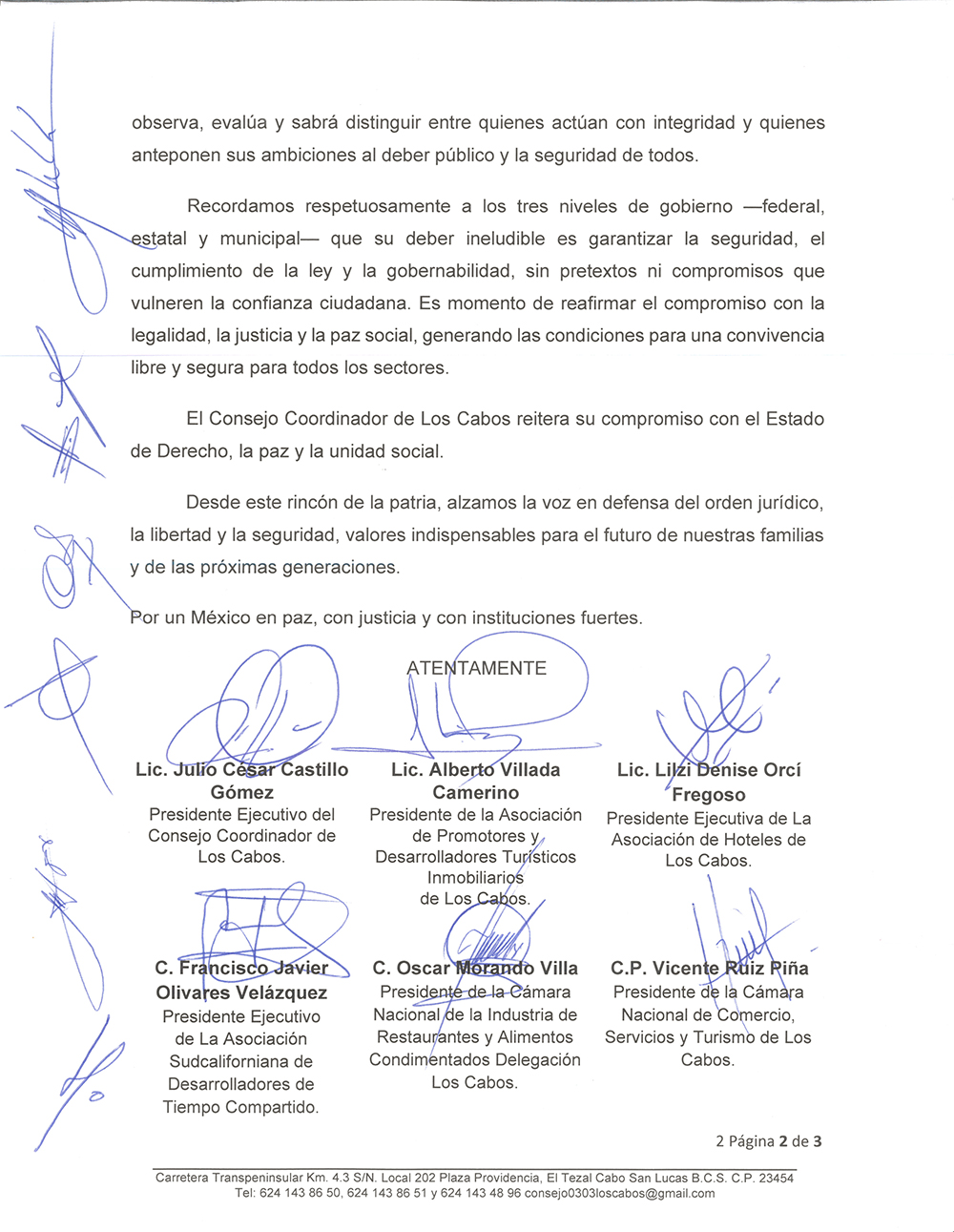 “El Consejo Coordinador de Los Cabos reitera su compromiso con el Estado de Derecho, la paz y la unidad social.
