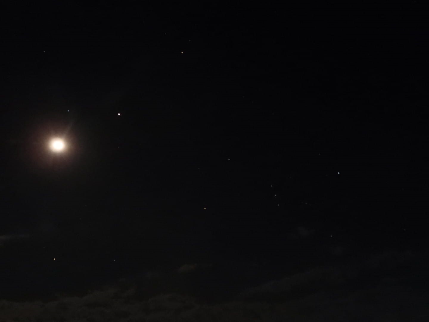 La Luna andaba de visita. Vista desde mi espacio a la derecha saludaba a la Constelación Orión, y también la de Cochero recibía el saludo en la parte izquierda.