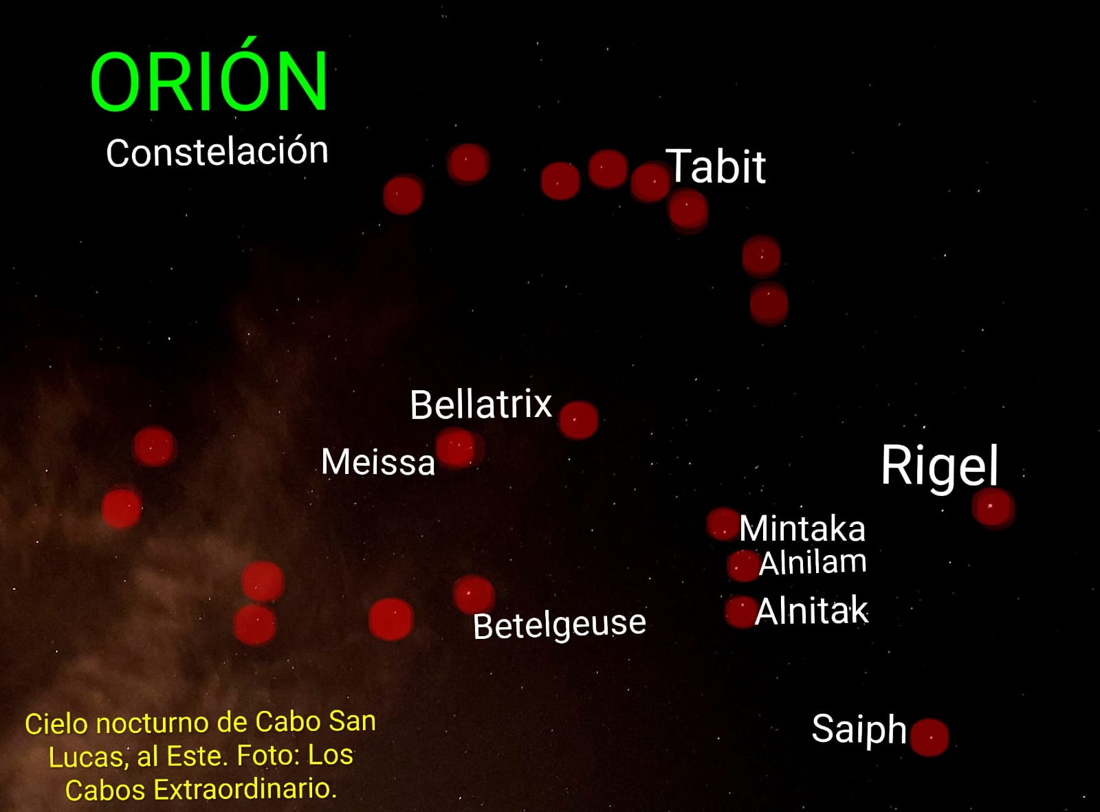 Con todos esos colosales vecinos estelares, Orión se observa imponente con su arco, como acechando a Tauro; la estampa estelar en el cielo nocturno de Cabo San Lucas se hace más bellísima al sumarse el magnífico cúmulo estelar de Las Pléyades.