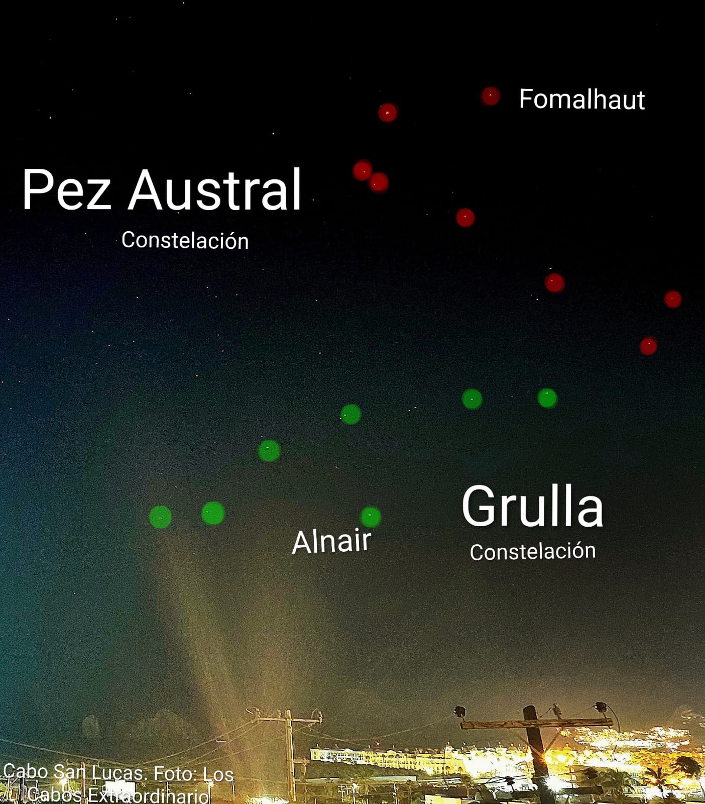 Constelaciones Pez Austral y Grulla sobre el lucerío de Cabo San Lucas. Foto: Los Cabos Extraordinario.