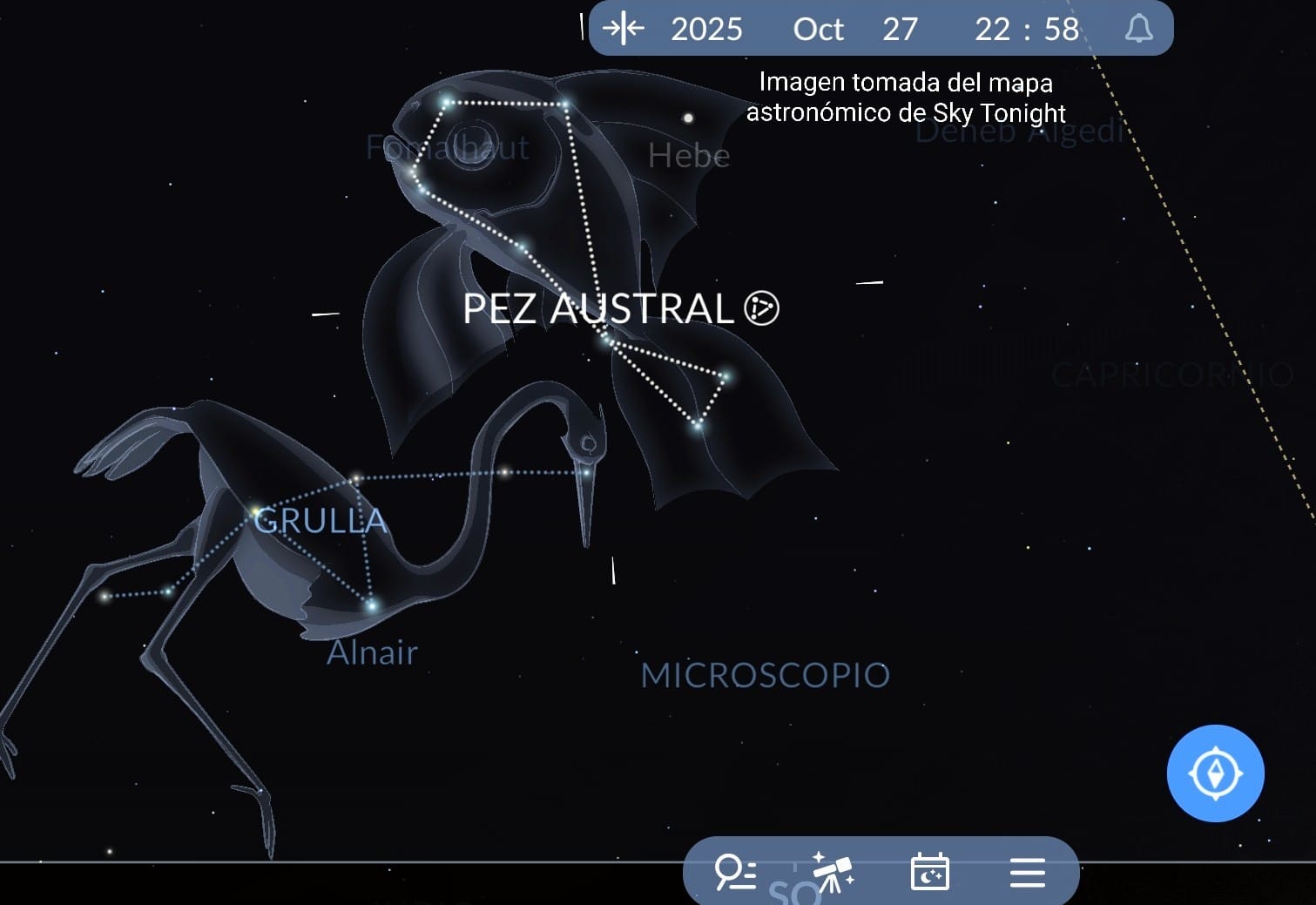 A la bellísima estampa se suman el saludo de Pez Austral y de Grulla, con sus impresionantes y brillantes estrellas en el universo Fomalhaut y Alnair, respectivamente.
