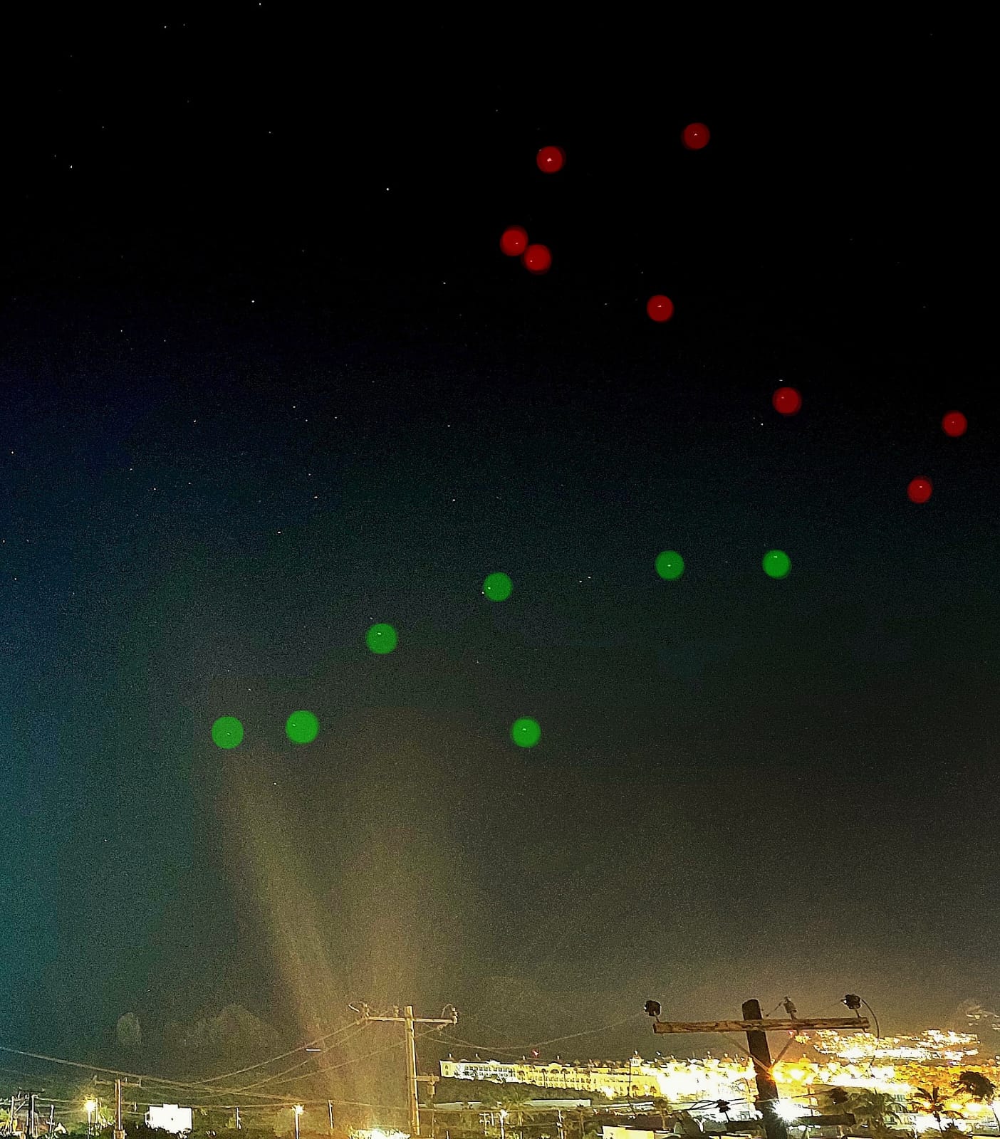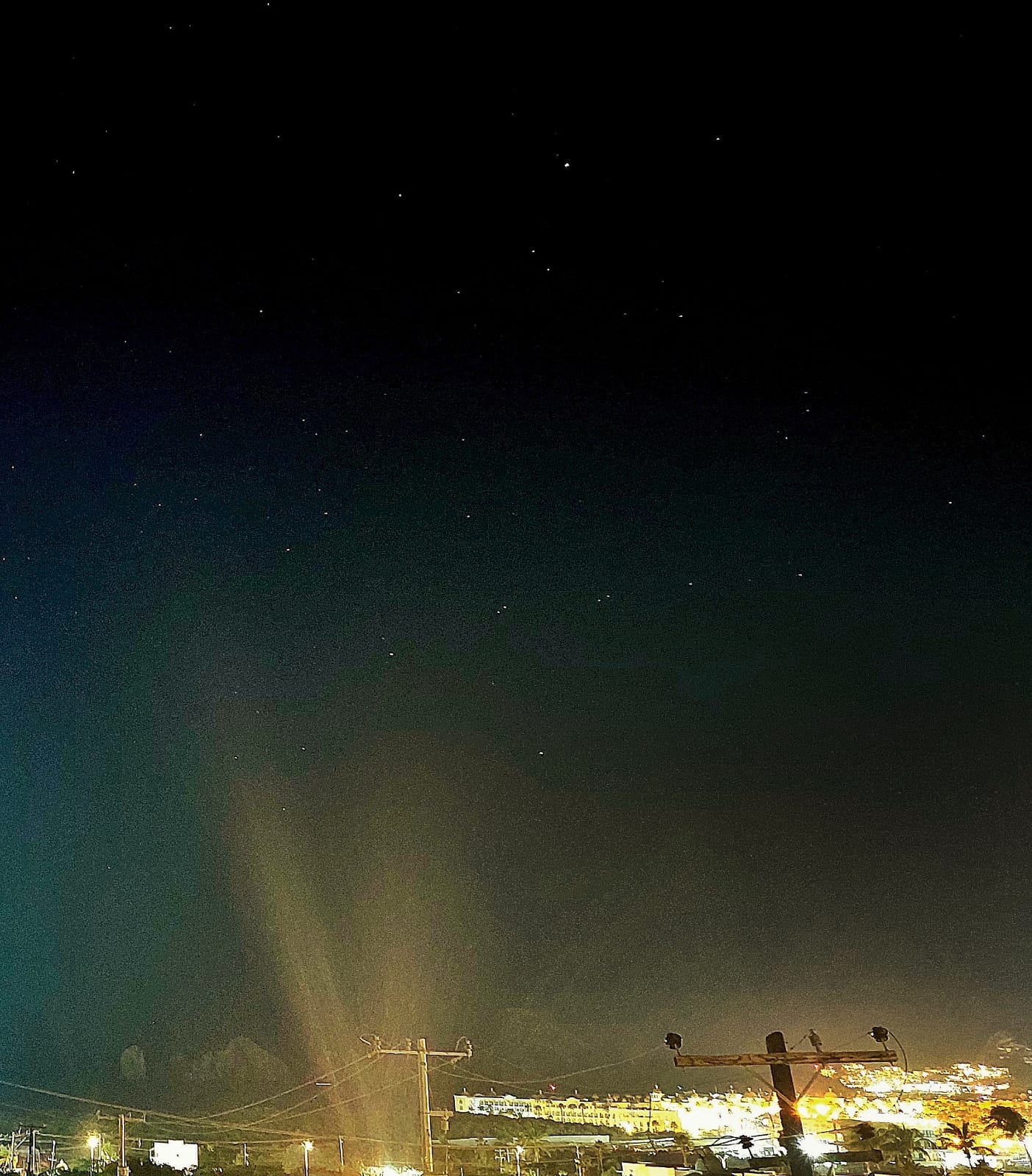 La majestuosidad estelar se impone a la banda del lucerío de Cabo San Lucas; en el cielo nocturno, al horizonte sobre la bahía de la ciudad portuaria sanluqueña, se alcanza a distinguir, además, la línea montañosa sudcaliforniana que, finalmente, alcanza al mar y que en la perspectiva oculta al ícono local, El Arco.