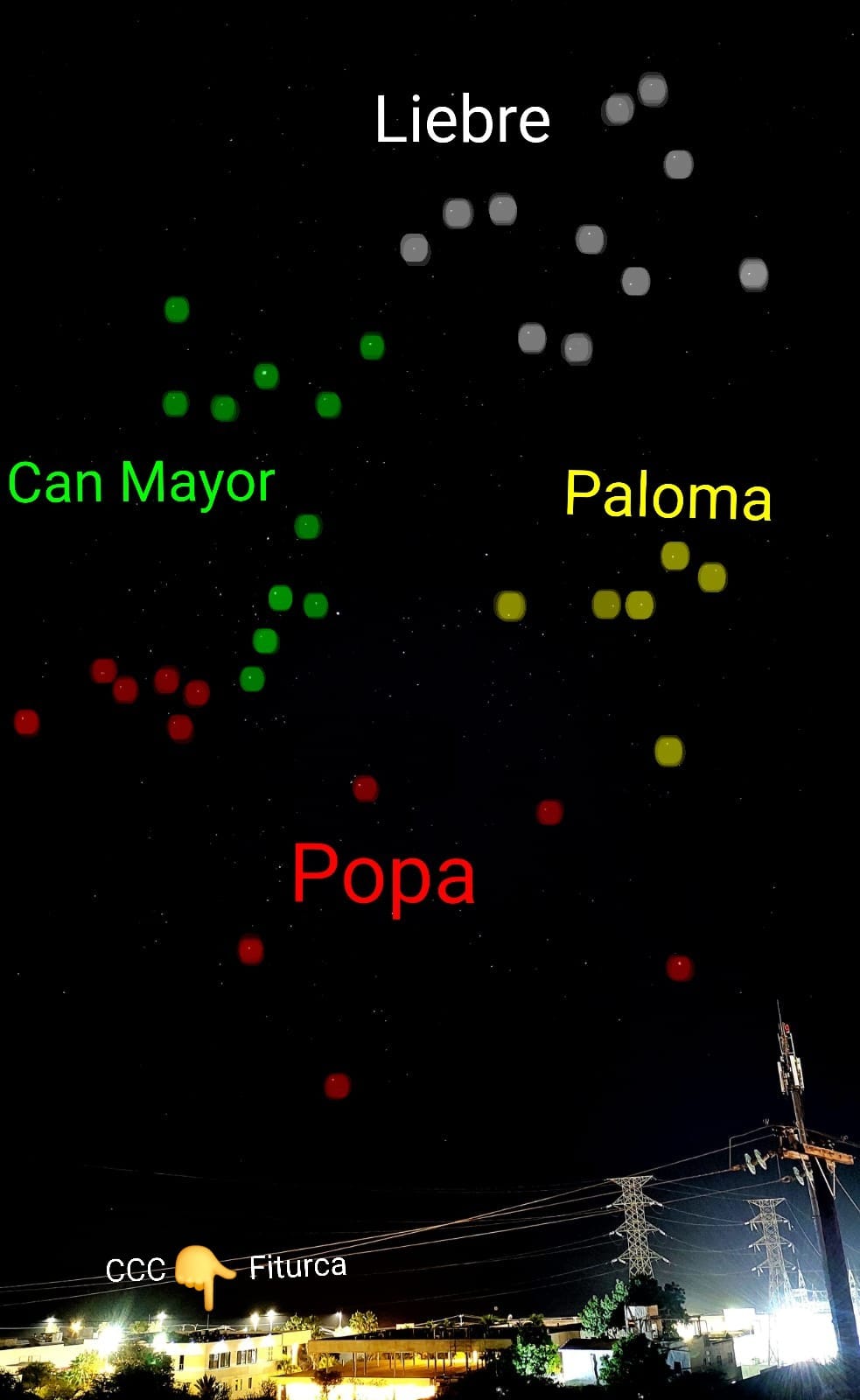 21:28 horas. Sobre el edificio que alberga al Consejo Coordinador Los Cabos –CCC- y al Fideicomiso de Turismo –Fiturca– cuatro constelaciones: Can Mayor, Liebre, Paloma y Popa. Entre los impresionantes elementos de la espectacular panorámica entre el Sureste (SE) y Sur (S) de Cabo San Lucas, las dos más  brillantes estrellas del firmamento: Sirio y Canopus.