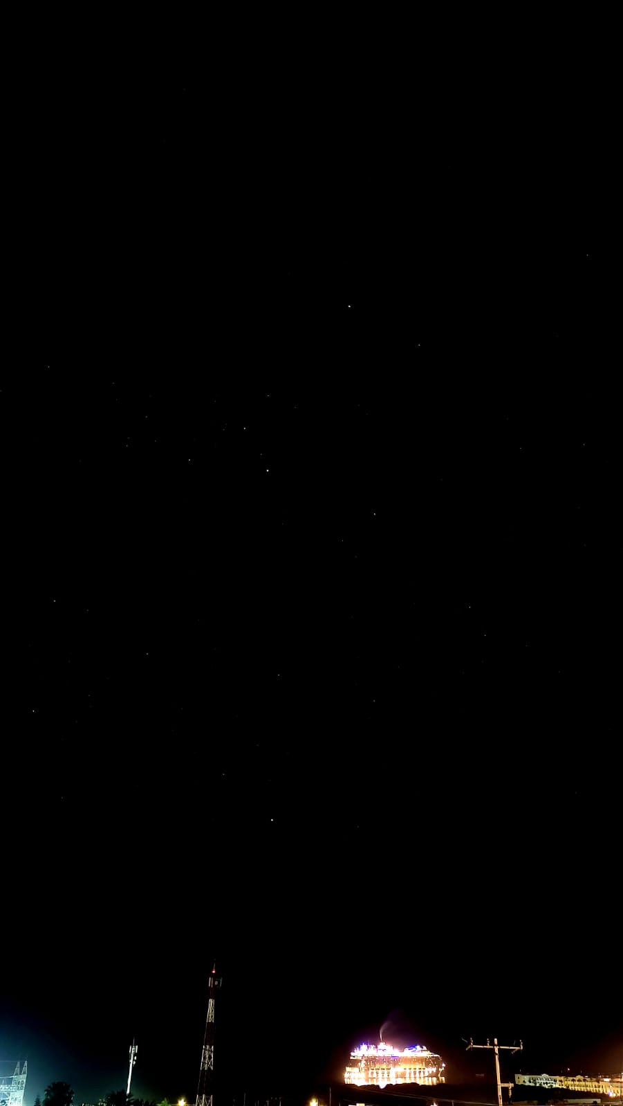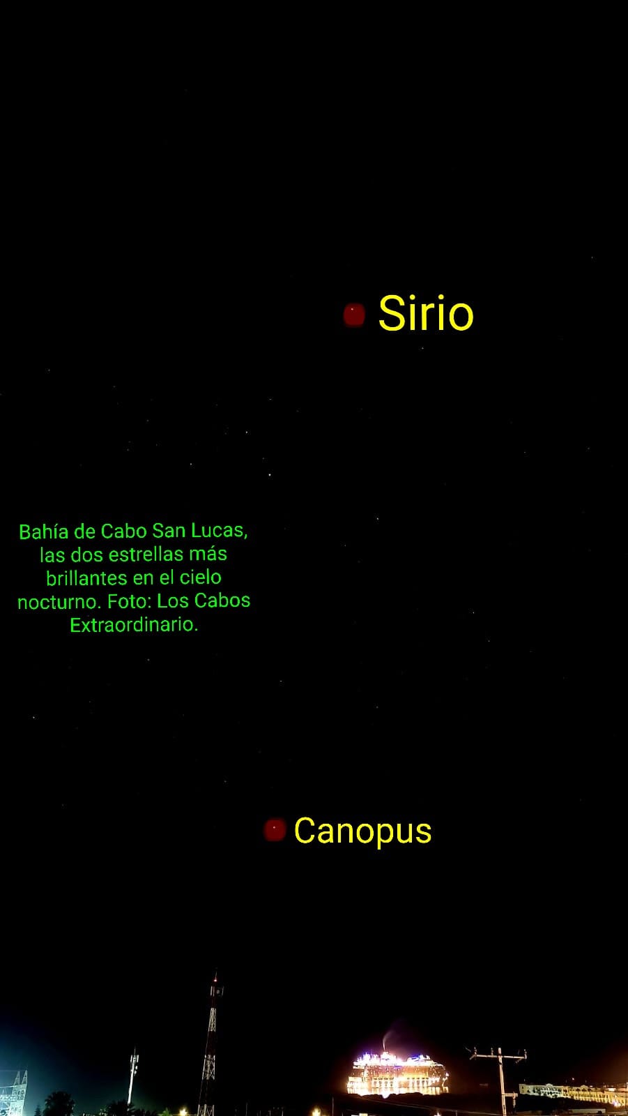 El crucero turístico se observa imponente en la bahía de Cabo San Lucas. Hacia el cielo nocturno, hacia el Sur, las dos estrellas más brillantes del firmamento. Faltan escasos seis minutos para las 12 de la noche.
