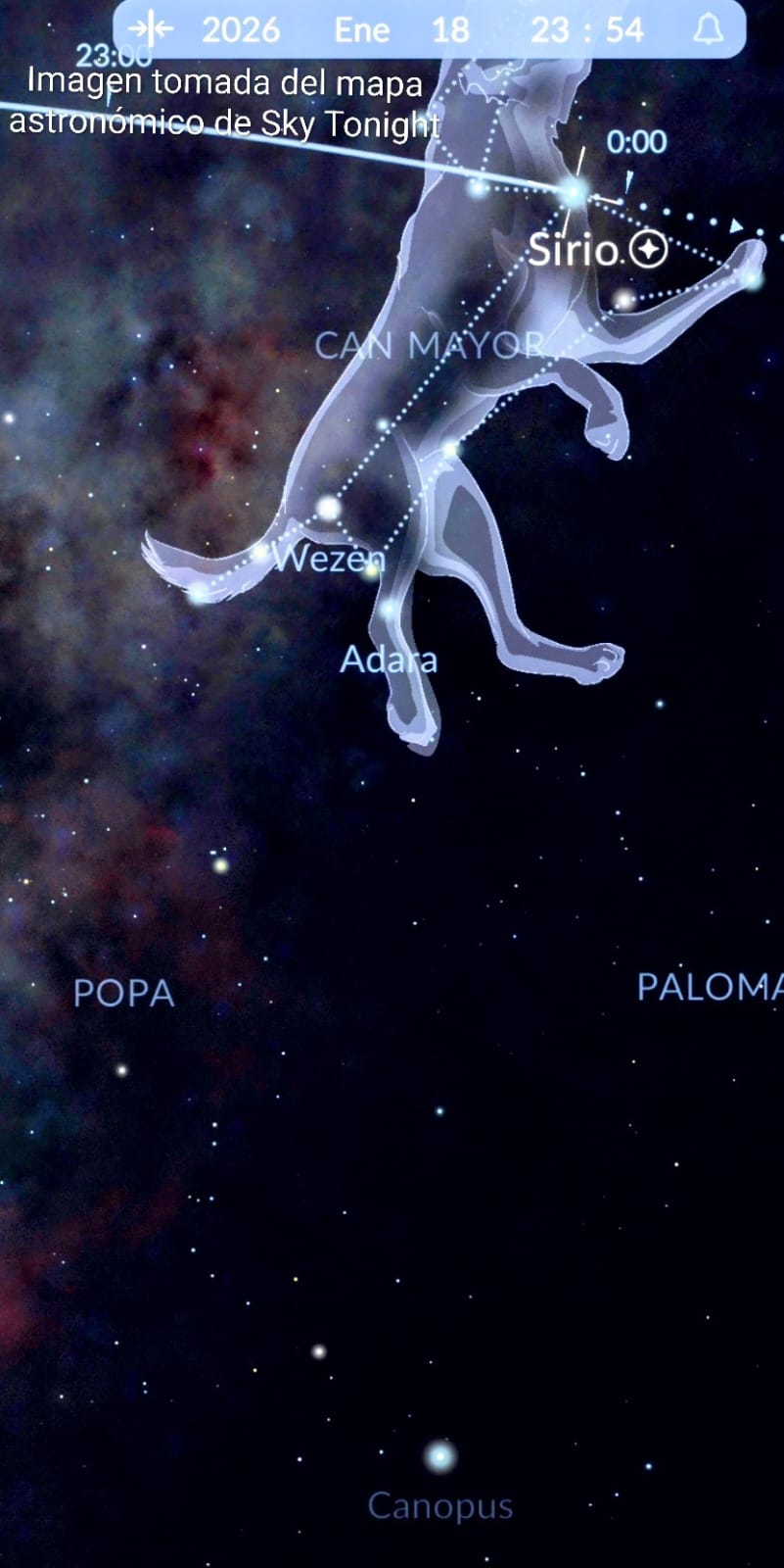 “Sirio, o Sirius en su denominación latina, es el nombre propio de la estrella Alfa Canis Maioris (α CMa, también Alfa Canis Majoris), la más brillante de todo el cielo nocturno vista desde la Tierra, situada en la constelación del hemisferio celeste sur Canis Maior. Esta estrella tan notable, que es en realidad una estrella binaria, es muy conocida desde la antigüedad; por ejemplo, en el Antiguo Egipto, la salida heliaca de Sirio marcaba la época de las inundaciones del Nilo,[12] y ha estado presente en civilizaciones tan dispares como la griega, la maya y la polinesia. En ocasiones, y coloquialmente, Sirio es llamada «Estrella Perro» a raíz de la constelación a la que pertenece”.