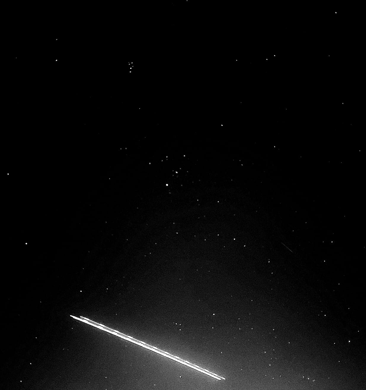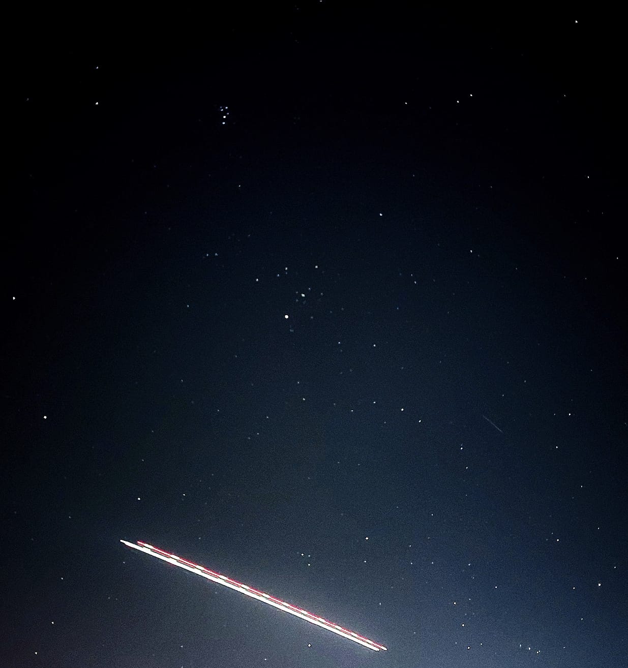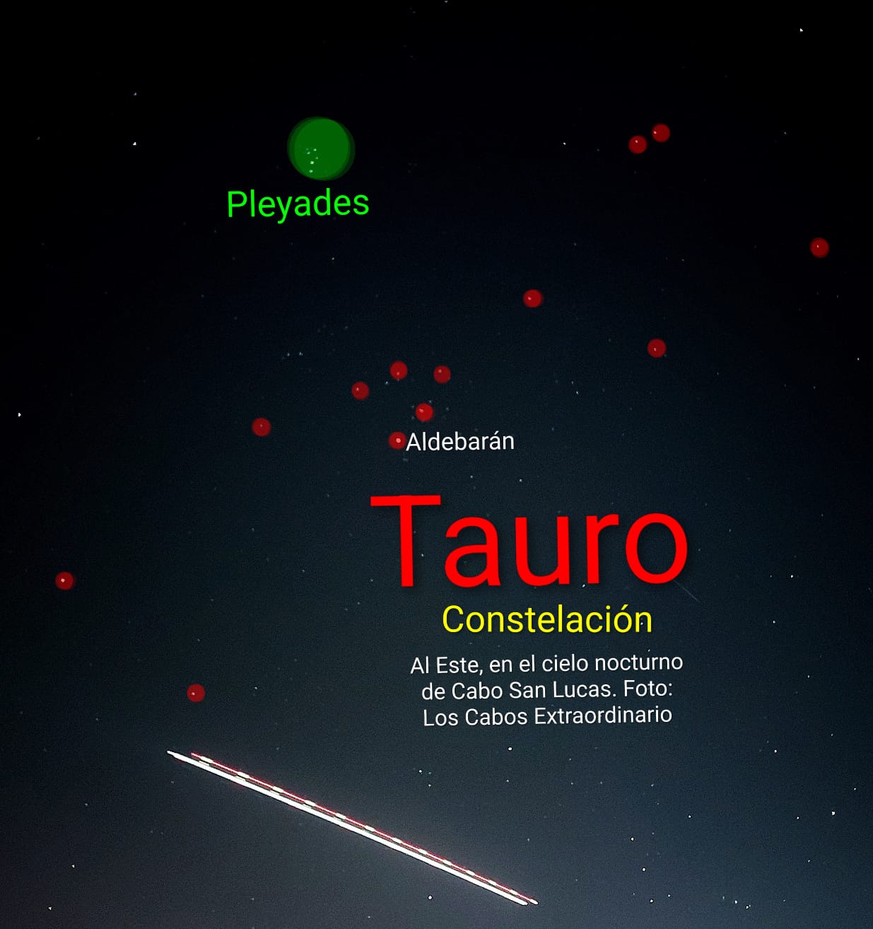 El vuelo de un avión se cruza al momento de la obturación fotográfica con 10 segundos de exposición al Este del cielo nocturno de Cabo San Lucas. En la magnífica postal estelar, Aldebarán, se observa imponente sobre el gran cazador Orión, arriba las fantásticas Pléyades; se está en el horizonte astronómico del gigantón Tauro.