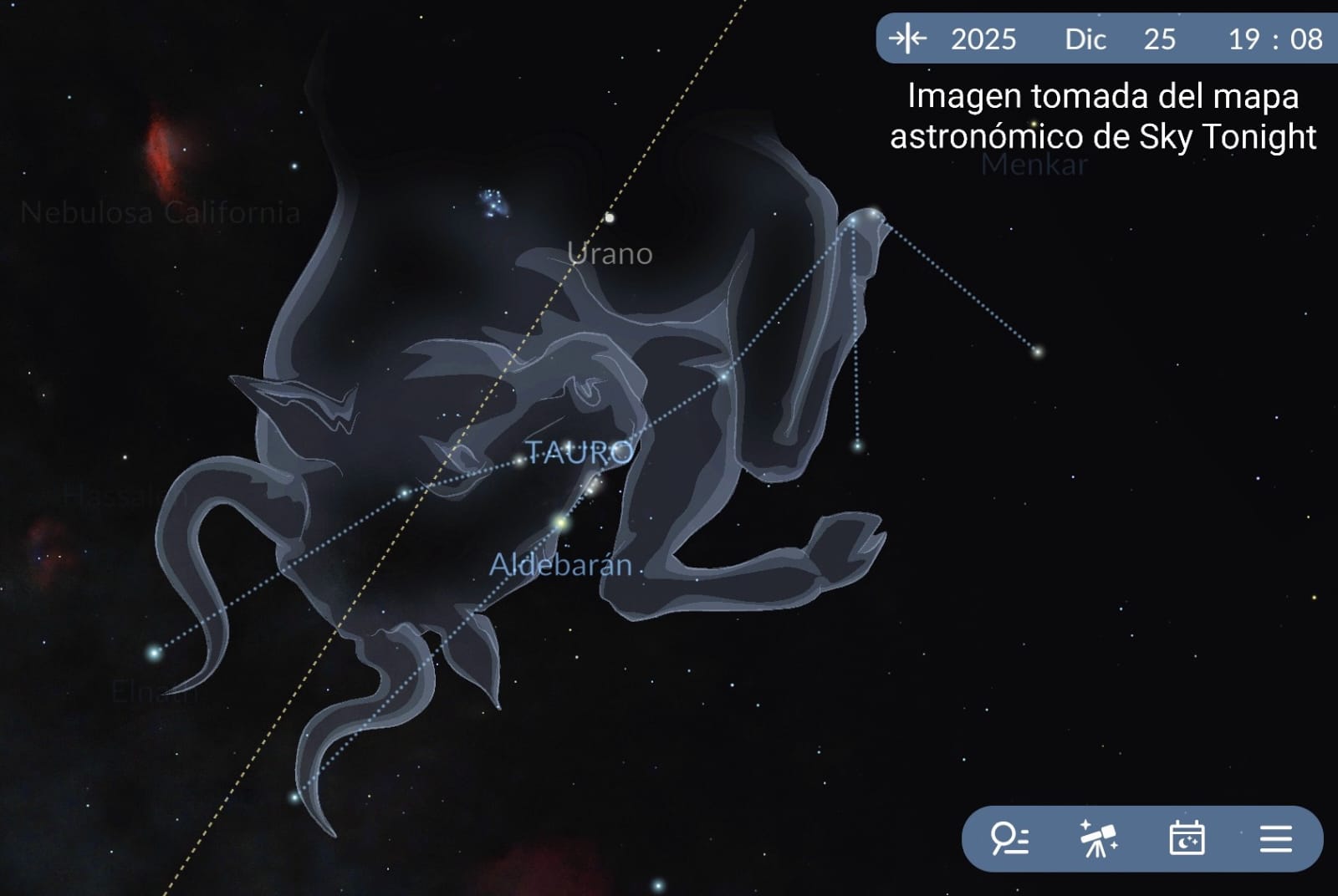 “Tauro o Toro (Taurus en latín) es una constelación zodiacal; su nombre en latín es Taurus y en español toro. Destaca en el cielo invernal del hemisferio norte (estival del hemisferio sur), entre Aries al oeste y Géminis al este. Al norte se encuentran Perseo y Auriga; al sureste Orión, y al suroeste Eridanus y Cetus”.