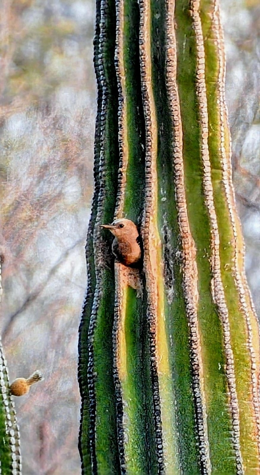 De inmediato agarró la onda. Se metió más al nido. Y en momentos nada más el piquito se veía. Y luego por periodos un poco largos, nada. Como si el nido estuviera vacío. Y el cardón sólo con un hoyo en medio.