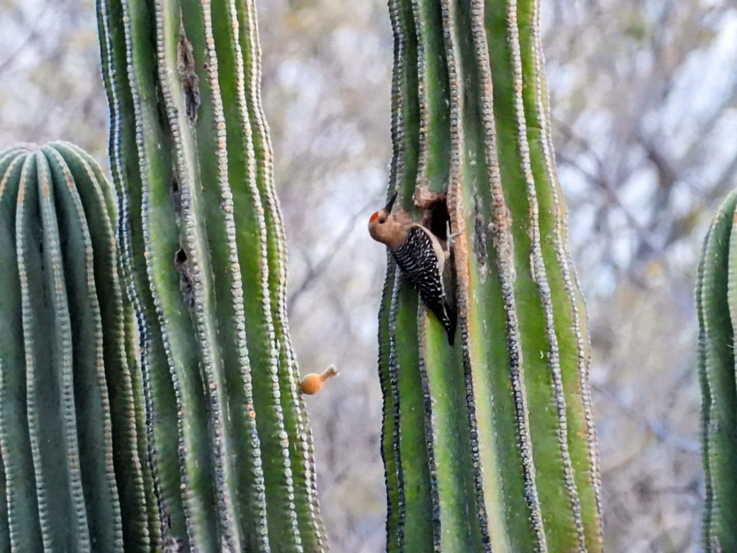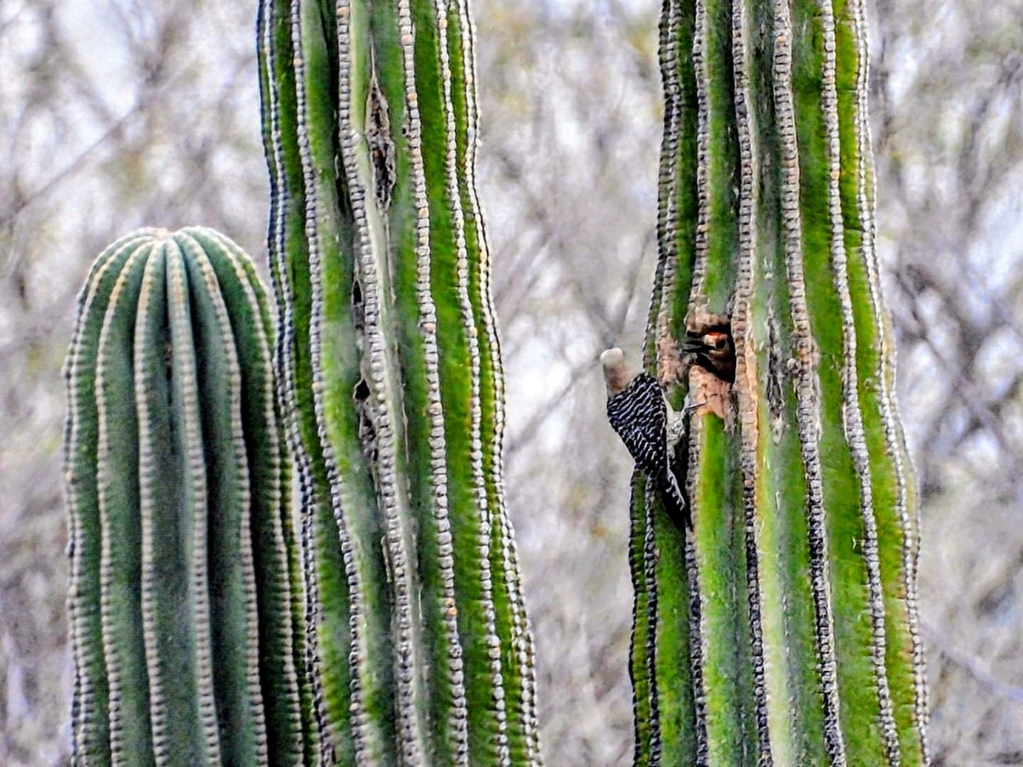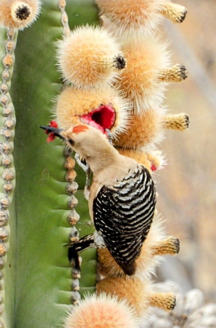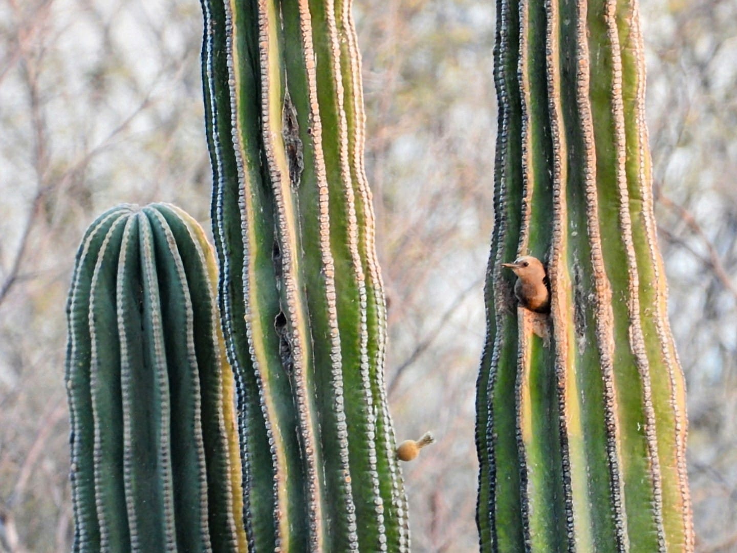 En el día con la familia del Carpintero del Desierto el polluelo de vez en cuando se deja ver cuando asoma por entre el nido de un Cardón (Pachycereus).