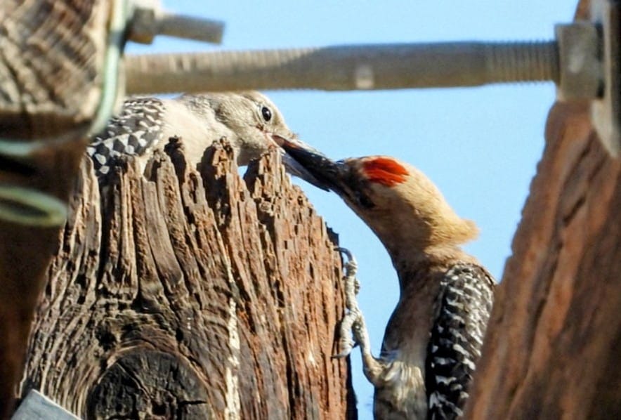 El polluelo ya activo alimentado todavía por la mamá un poco lejos del nido. De un cactus a un poste.
