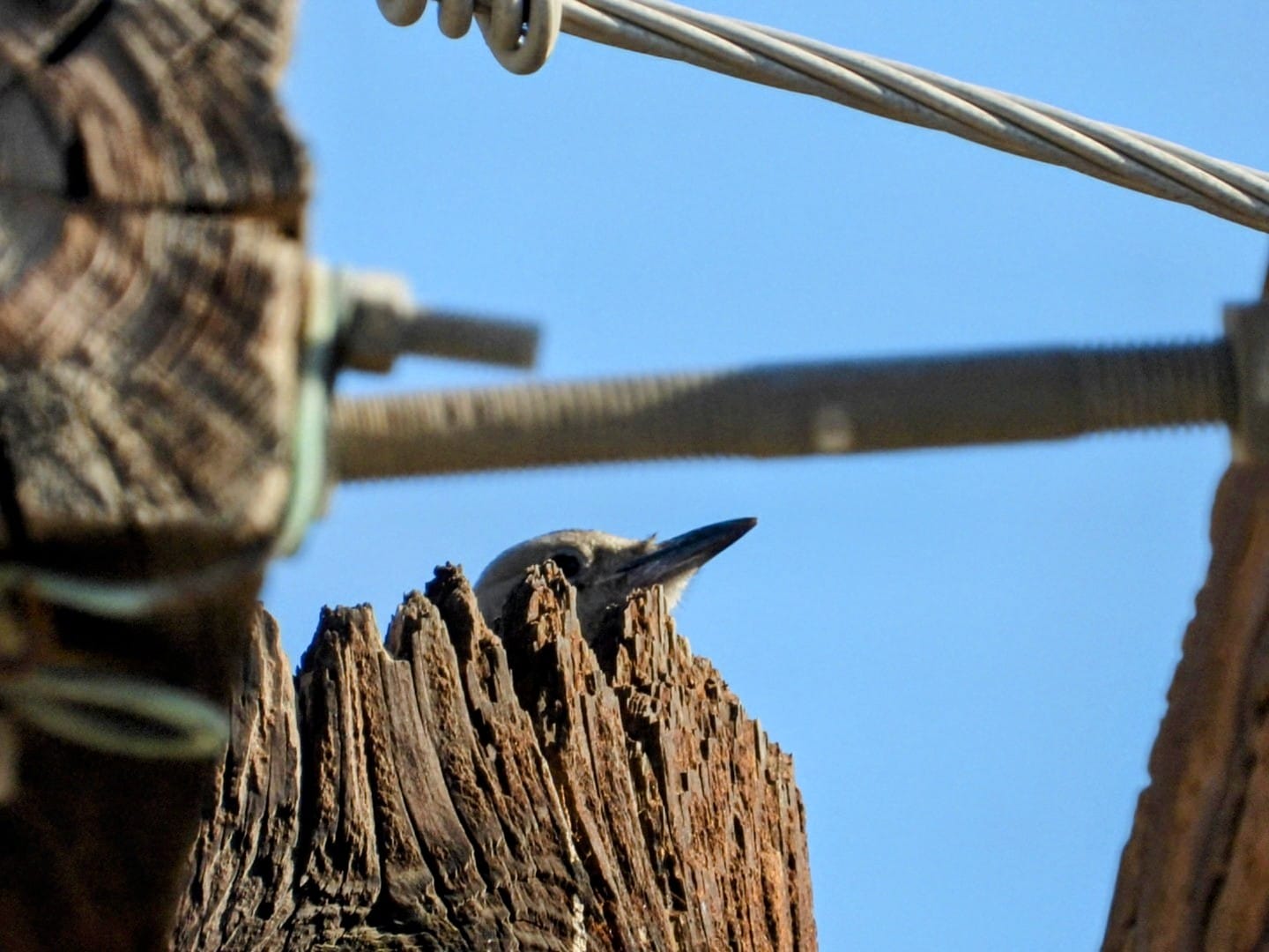 Durante días, a lo lejos, observé el permanente ir y venir de mamá Carpintero del Desierto para alimentar a su polluelo. Y el polluelo saca y mete, curioso, su pequeña cabeza, apenas si el piquito salía del nido.